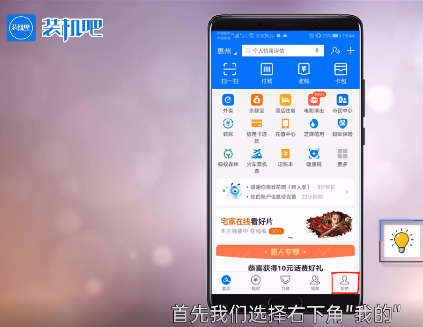 1,首先我们进入支付宝页面,再选择右下角我的。