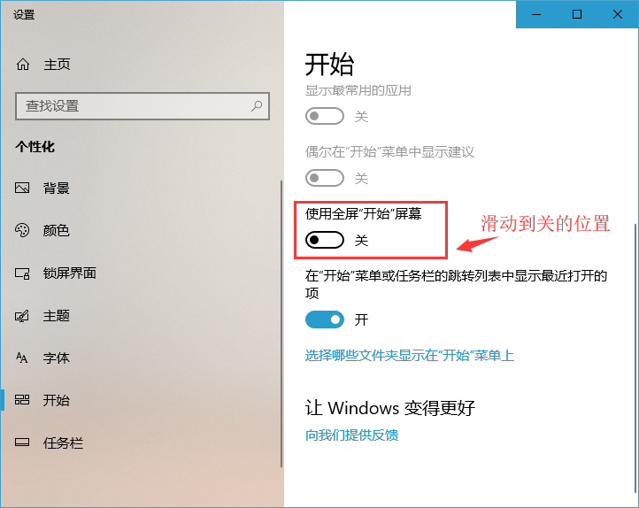 3、点开“开始”后,在其右侧找到“使用全屏工“开始”屏幕,将其滑动到关的位置上面即可”