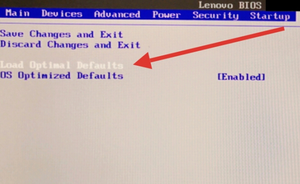 1、联想电脑开机以F2键打开BIOS,直接在Exit那里点击Load Optimal Defaults进入。