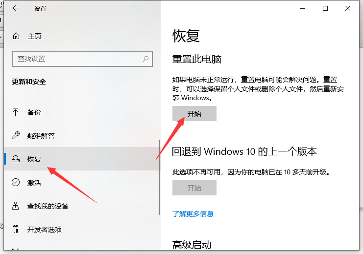 3.进入到该页面之后,我们在左侧找到出现的恢复按钮,此时在右侧的功能栏中可以看到出现了一个重置此电脑的选项,下方有个开始的按钮,我们点击这个开始。
