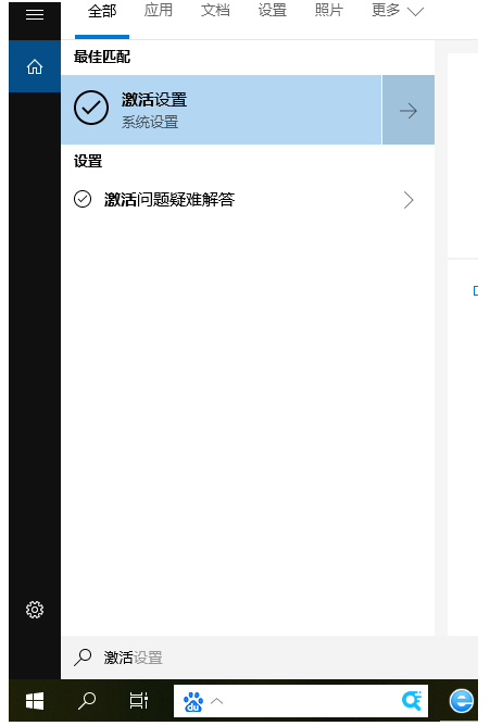 1、点击系统桌面底部的搜索,输入激活设置,点击进入。