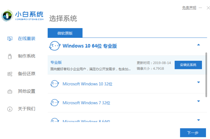 1、打开软件,选择需要安装的win10系统。(4g以上内存选择64位系统)