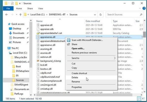 在安装windows11系统的过程中,如果提示电脑配置不满足,我们只需要删除一个文件就可以绕过所有硬件的限制。首先在电脑上打开文件资源管理器,然后定位到C:\$WINDOWS.~BT\Sources文件夹,在这里找到appraiserres.dll文件并把其删除,接下来返回到安装界面,点击后退按钮,再点下一步就可以正常升级Windwos11系统了。