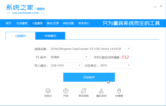 1、在一台可用的电脑上下载安装系统之家一键重装系统工具,关闭电脑的杀毒软件,插入一个8g以上的空白u盘,选择u盘模式开始制作。