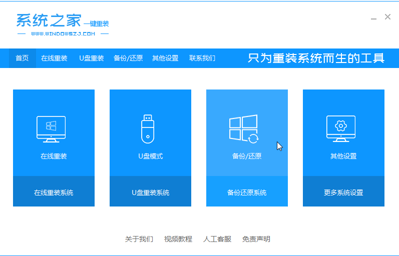 1.首先将下载的win10系统镜像解压到非系统盘,然后下载安装系统之家一键重新安装系统软件并打开,点击[备份和还原]。注意在安装前备份系统盘上的重要数据。