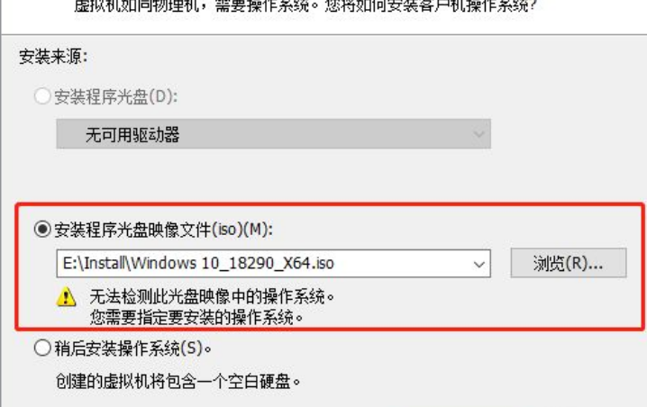 3、选择【安装程序光盘映像文件(iso)】,并点击【浏览】按钮,选择win10的iso安装文件,如果提示“无法检测此光盘映像中的操作系统”,可以忽略这个提示,只要您的安装文件是正常的,直接点击【下一步】按钮。