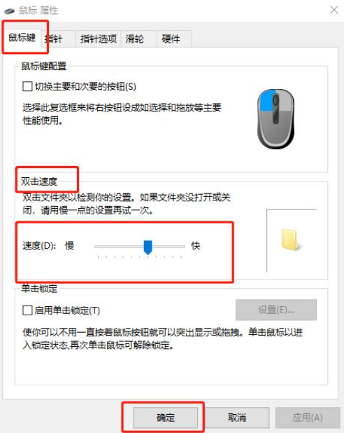 5.进入后,上方切换到【鼠标键】选项,然后调整鼠标双击速度,完了之后点击【确定】。