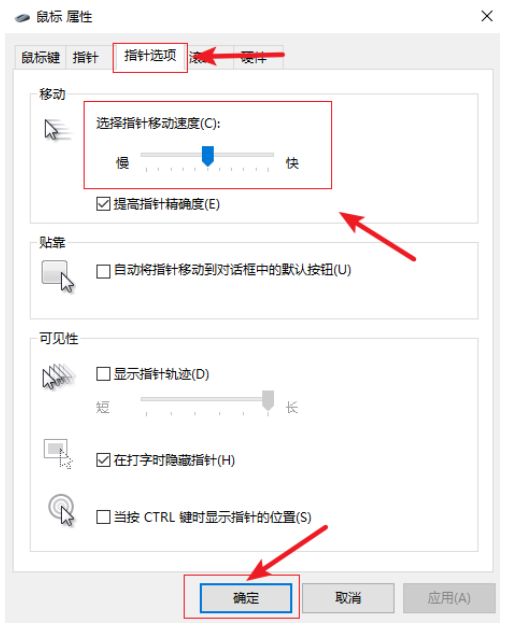 3.在鼠标属性界面,把上方的选项卡切换到【指针选项】,然后拖动移动速度的进度条调整鼠标灵敏度,调整好之后点击下方的【确定】按钮即可。