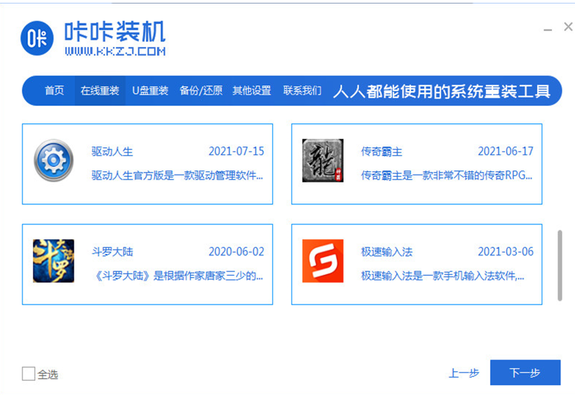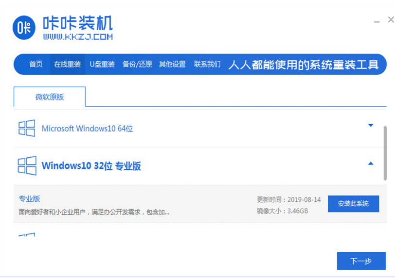 1、上网下载咔咔装机工具,点击在线重装系统。选择要安装的系统版本,点击下一步。