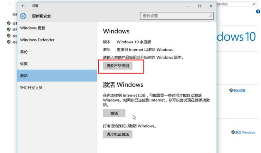 2、也可以点击开始—设置—更新和安全—激活—【更改产品密钥】;