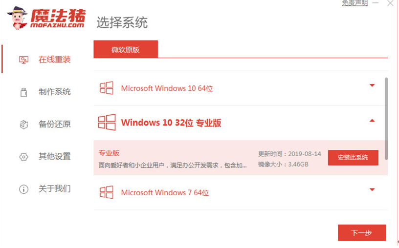 1、网上下载魔法猪装机软件,打开点击在线重装系统选择要安装的win10系统,点击下一步。