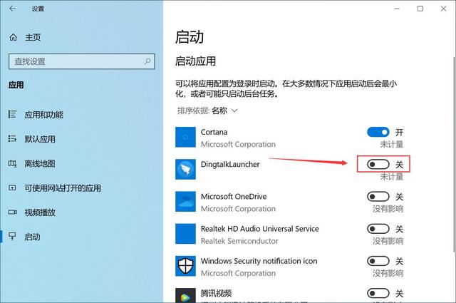 2、进入应用设置,左侧导航点击“启动”,然后右侧的应用有启动的,开关点击关闭。