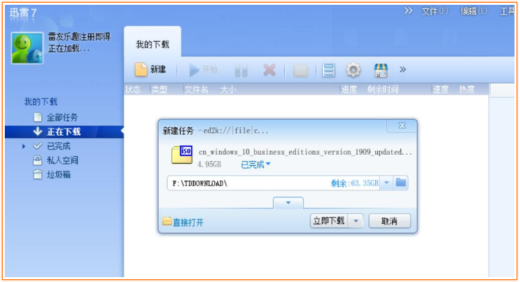 5. 复制ed2k地址后,再打开迅雷软件下载win10专业版镜像,等待下载完成就可以了。