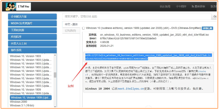 4. 选择win10专业版的版本,然后复制ed2k地址。