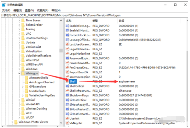 5、鼠标左键单击:Winlogon,找到Shell。然后左键双击Shell,如果Shell的数值数据为:explorer.exe,则是正确的,如果不是explorer.exe,则把Shell的数值数据更改为:explorer.exe,最后点击确定重启即可。