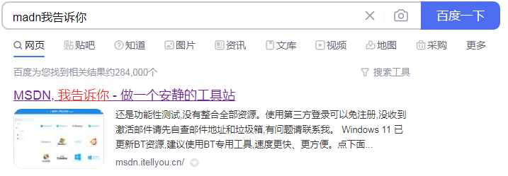 1、下载msdn我告诉你win10,首先打开浏览器,百度搜索【msdn我告诉你】,点击第一个搜索结果进入。