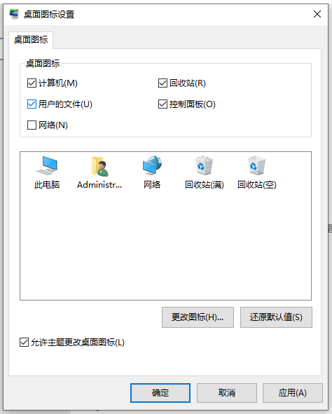 3、将桌面系统图标都点击勾选上,点击应用并确定,这样就可以恢复桌面的系统图标了。
