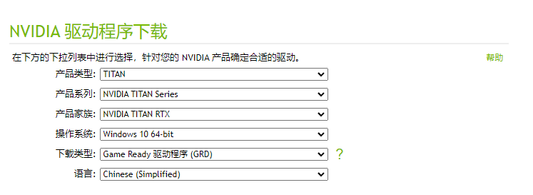 转到此处的NVidia驱动程序下载页面:https://www.nvidia.cn/Download/index.aspx?lang=cn