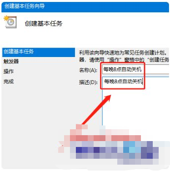 4、接着给任务命名一个名称如每晚8点自动关机,点击下一步。