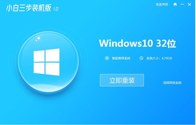 1、首先网上查找并下载小白三步装机版工具打开,选择原版的win10系统,点击立即重装。
