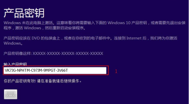 7、接着输入密钥:VK7JG-NPHTM-C97JM-9MPGT-3V66T ,点击下一步。没有密钥的话,可自行在“装机吧官网”内查找激活方法。