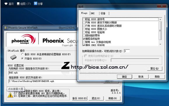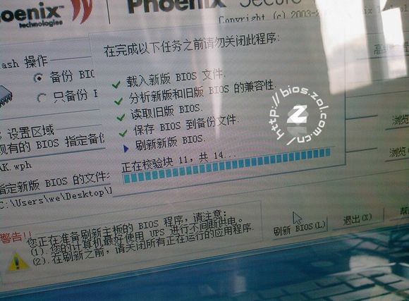 然后点确定就可以开始降级bios了,程序出现一些提示,点下一步就可以了。记住刷之前把所有能关的程序都关掉,还确保要接上电源,防止断电,USB外接设备和网线等都拔了..