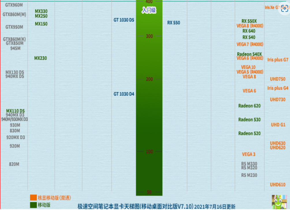 下面是花飞羽落版本的移动平台显卡天梯图,收集的笔记本电脑显卡型号比较全面,几乎囊括了所有型号的移动显卡。包括nvidia独显,amd独显,intel核显和apple芯片,括号内的表示显卡功耗。目前笔记本显卡排行天梯图排在前二十名的显卡型号依次是: