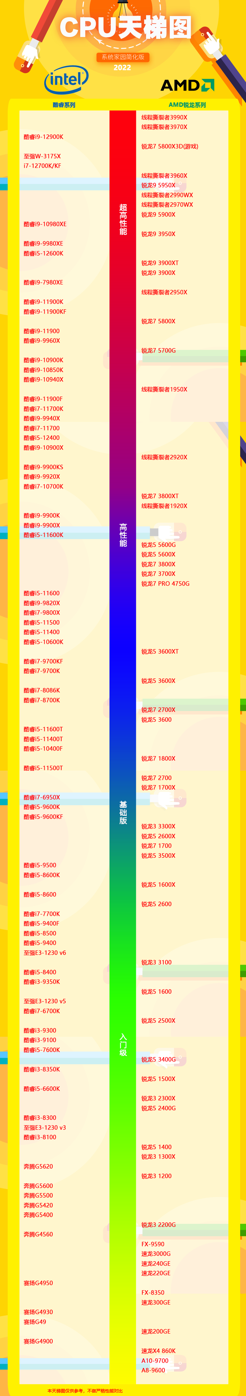 对于许多网友来说,CPU处理器的性能在电脑中是优先考虑的,在现在的市场上CPU只有英特尔和AMD比较著名,是大家的首选。进入2022了,我们来看看最新电脑CPU排行榜以及为大家奉上2022最新电脑cpu天梯图,在助于大家在购买时参考,一起来看看吧。
