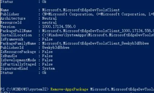2、在这里输入代码 get-appxpackage *edge*,查找edge浏览器的安装包名称。
