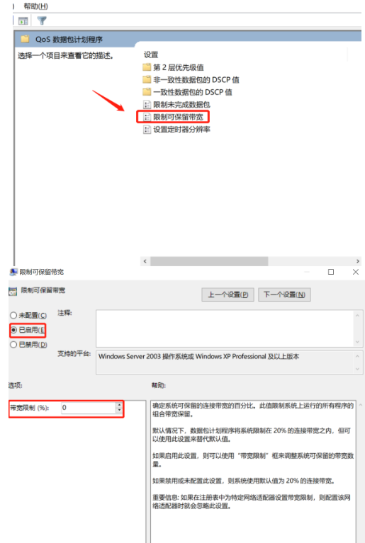 3.然后双击【可保留宽带】、弹出【限制可保留宽带】界面,选择【已启用】,【宽带限制0】即可解除网络限速。