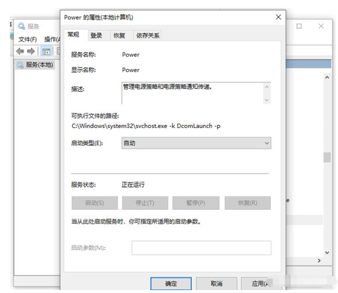 2、选中右边的Power,双击打开,确保已启动,随后把启动类型设置为自动,点击确定。