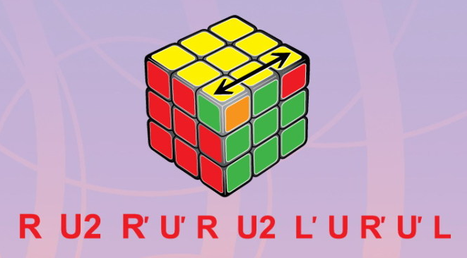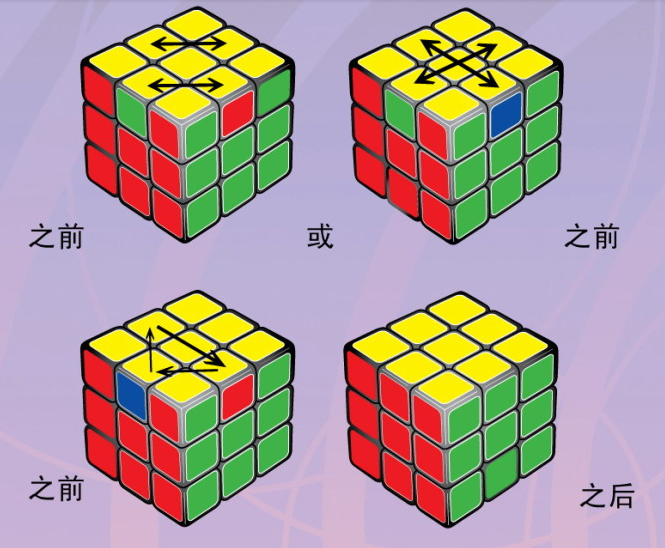 2、让中层边块归位,将顶层(应该是黄色)边块调整向上,做出黄十字;