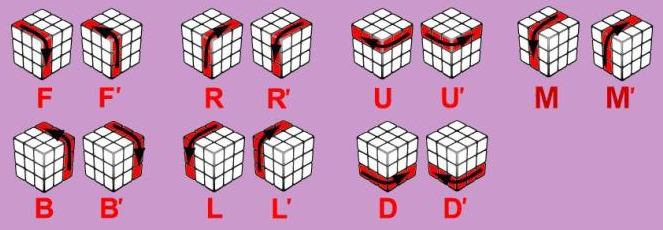 2、用字母来说明要转动的1层或1面,以及方向,例如:F(代表前面顺时针转90度),F`(代表前面逆时针转90度),R2(代表右面顺时针转2次90度)。
