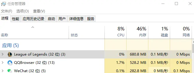 2、在进程下,选定“应用”中的“英雄联盟”。