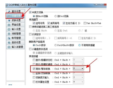 2、选择“按键设置”进入,选中“简体/繁体转换”选项打勾。