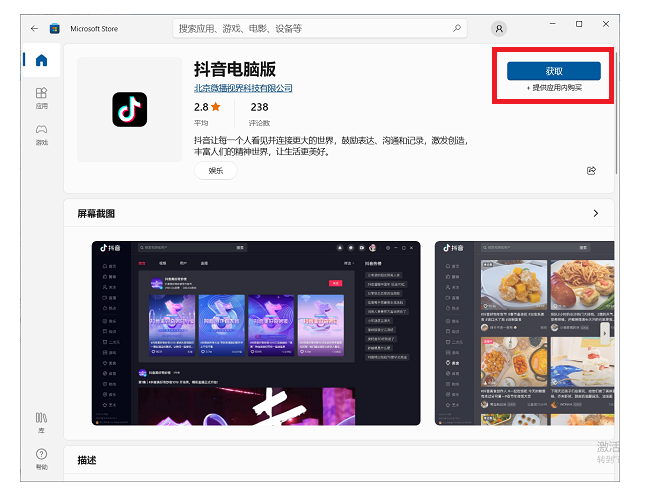 2、点击右上角的【获取】就可以下载抖音电脑版。