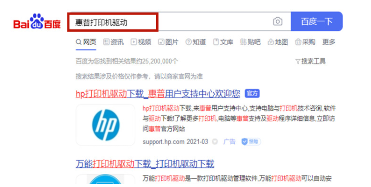 1.我们首先在百度中搜索“惠普打印机驱动”,点击有“官方”标识的网站就可以惠普驱动的更新网站。