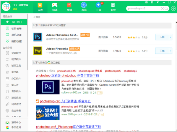 2、点击软件管家之后,在搜索框中搜索“photoshop cs6”,出现软件之后,我们点击下载。
