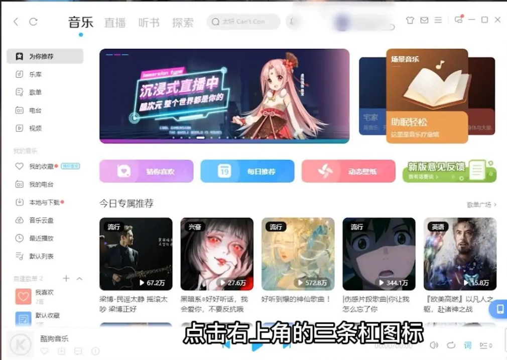 1、首先打开酷狗音乐软件,进入界面后点击右上角的三条杠图标。