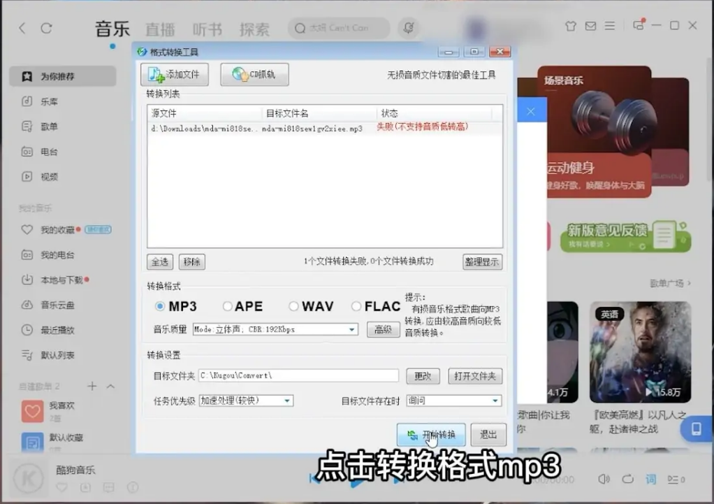 4、选择音乐之后,单击转换格式mp3,点击下方转换文件就完成啦。