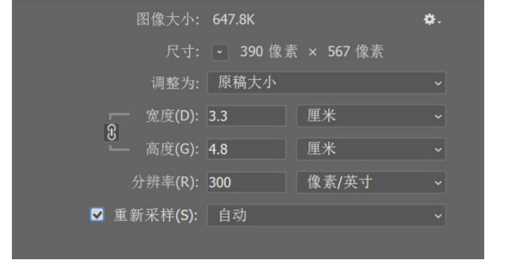 3、2寸照片,尺寸大小是:3.5厘米×5.3厘米,分辨率设成300像素/英寸,达到的像素是:413×626。