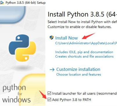 2.2.1 安装的时候,首先要选中 Add Python to PATH 前面的复选框,如果想要安装到默认路径,直接点击 Install Now,就可以安装了。如果你想自己选中安装路径,则不要直接点击 Install,跳到 2.2.2 步骤。如果你想自己选择安装路径,则执行步骤 2.2.2,如果默认安装的话,直接跳到步骤 2.3 就可以了。