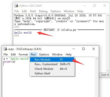 打开之后,点击菜单里的 Run → Run Module,或者直接按 F5 键也可以。这时候,就会在 Python Shell 里运行这个 Python 文件: