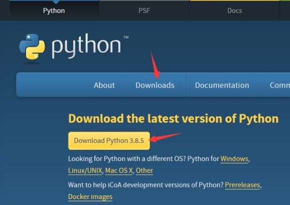1.1 打开 Python 官方网站,点击 Downloads,然后点击 Download Python 按钮,本文发表时最新版本已经是 Python 3.8.5 了。Python 官方网站:https://www.python.org