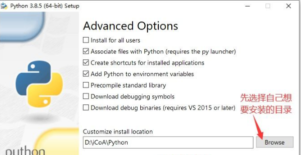2.2.4 在 Advanced Option 窗口,点击 Browse 可以选择想要安装的目录,然后点击 Install 安装。