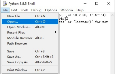 3.3 IDLE 除了可以直接输入 Python 命令行命令之外,还可以打开和新建 Python 程序源文件,直接点击 File,然后点击 Open 找到 .py 扩展名的程序文件就可以打开。