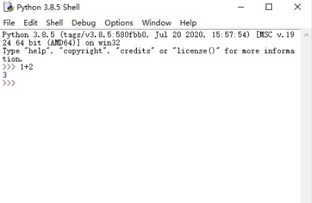 3.2 会打开 IDLE 交互式开发环境 Python Shell。可以试一下简单的 Python 语句,比如输入 1+2 回车看一下,如下图就是安装成功了。