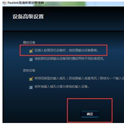 3、将“在插入前面耳机设备时,使后面输出设备静音”的选项取消勾选点击确定即可;