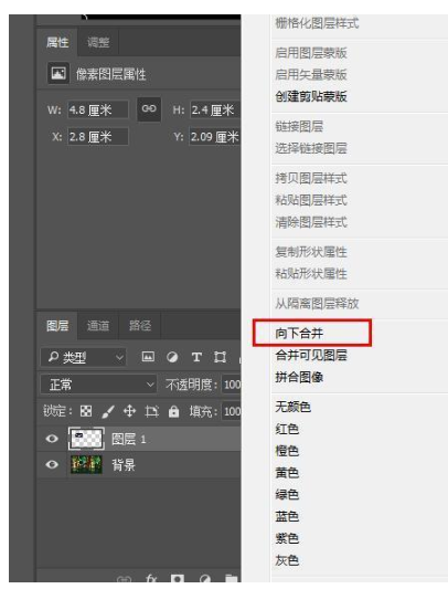 方法一:在第一张图层点击鼠标右击,选择向下合并 ,即完成第一种合并图层的方法。