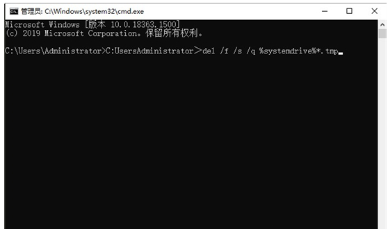 2、输入“C:UsersAdministrator>del /f /s /q %systemdrive%*.tmp”命令,点击“回车”键,系统就会自动删除所有的tmp文件。